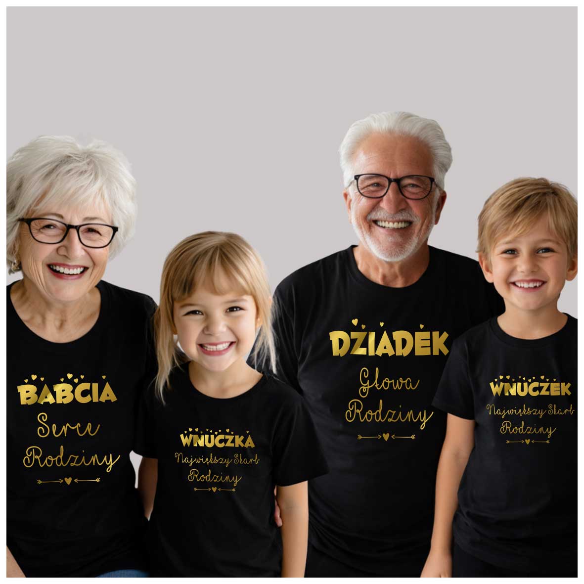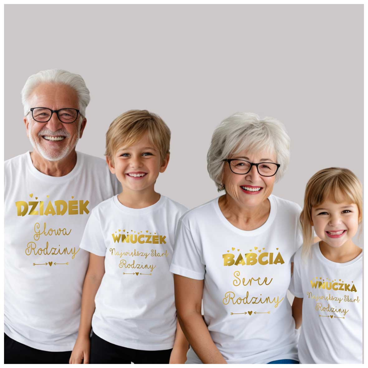 Podkreślcie wyjątkową więź międzypokoleniową dzięki zestawowi dopasowanych koszulek rodzinnych! Ten czteroosobowy komplet zawiera koszulki dla babci, dziadka oraz dwójki wnuków (do wyboru rozmiary dziecięce – od niemowlaka po nastolatka). Wspólny nadruk lub tematyczne napisy sprawią, że cała rodzina będzie wyglądać spójnie i stylowo – na co dzień, na wakacjach, podczas rodzinnych spotkań czy sesji zdjęciowych.