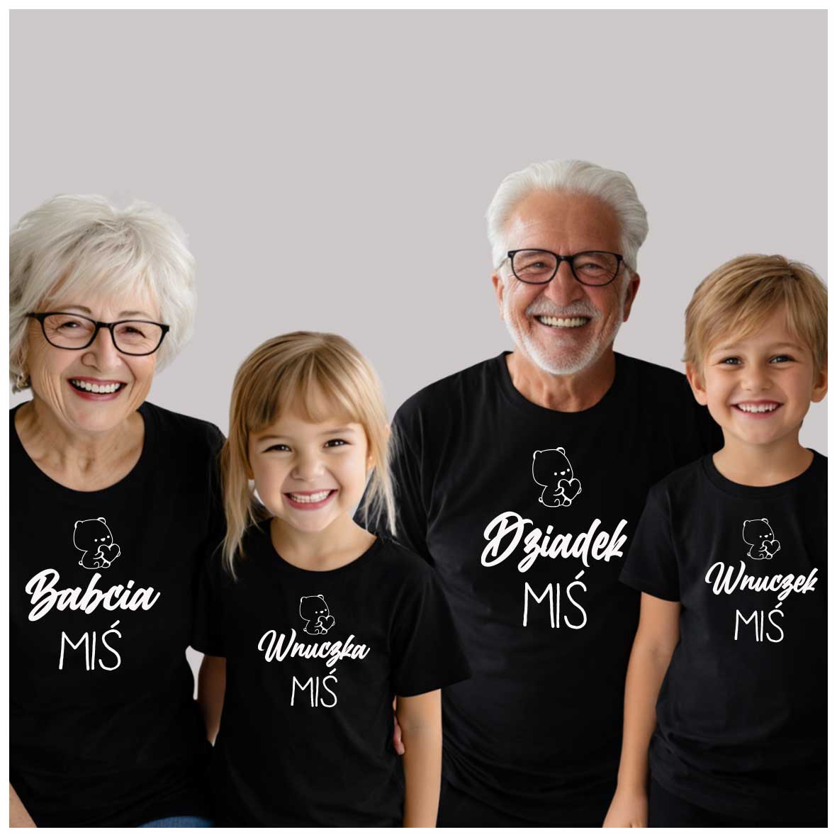 Podkreślcie wyjątkową więź międzypokoleniową dzięki zestawowi dopasowanych koszulek rodzinnych! Ten czteroosobowy komplet zawiera koszulki dla babci, dziadka oraz dwójki wnuków (do wyboru rozmiary dziecięce – od niemowlaka po nastolatka). Wspólny nadruk lub tematyczne napisy sprawią, że cała rodzina będzie wyglądać spójnie i stylowo – na co dzień, na wakacjach, podczas rodzinnych spotkań czy sesji zdjęciowych.