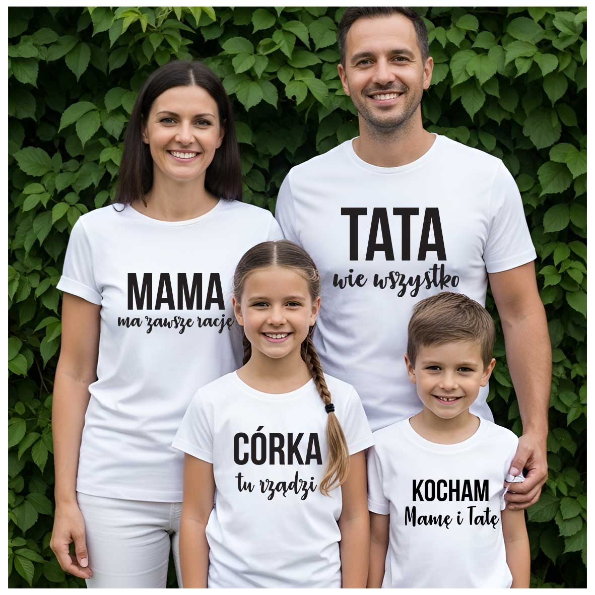 Podkreślcie Waszą wyjątkową więź dzięki zestawowi dopasowanych koszulek rodzinnych! Ten czteroosobowy komplet zawiera koszulki dla mamy, taty oraz dwójki dzieci (do wyboru rozmiary dziecięce od niemowlaka do nastolatka). Wspólny nadruk lub tematyczne napisy sprawią, że Wasza rodzina będzie wyglądać spójnie i stylowo – na co dzień, na wakacjach, na sesji zdjęciowej czy podczas rodzinnych uroczystości.